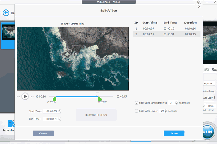 Hit Done after you set everything properly. Click on RUN to active VideoProc Converter AI to split the MKV file.