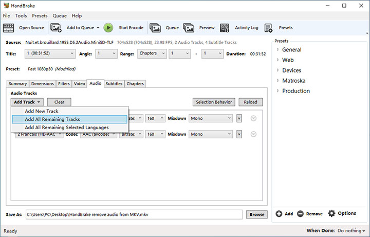 HandBrake is one of the most famous video transcoders. This program is free and open source. Thanks to its broad format support, in this case, you can also use HandBrake to remove the audio track from MKV. Below are the steps to use HandBrake remove audio track from MKV.