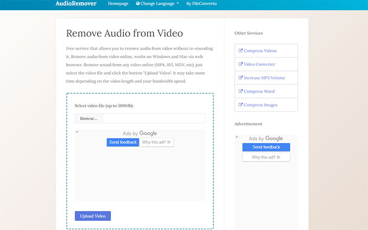 AudioRemover is a good choice if you want to remove audio from video online without installing any software. It's compatible with almost all browsers and suitable for occasional uses. Although there are some annoying ads on the webpage, it is easy to see how to use it.
