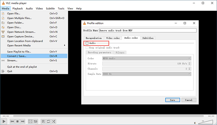 Go to Media > Convert / Save from the top menu bar. Add the video to VLC, then uncheck the Audio option in the Audio codec tab. Finally, click Start to remove all the audio tracks from the video.