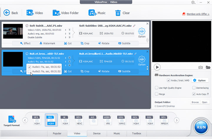 VideoProc Converter AI can help remove unwanted audio tracks from MKV, be it a specific audio stream or all audio tracks. Import your MKV file and go to the audio information section under the video name. Uncheck the audio track you want to remove. Then force copy the codec for the other tracks. Click RUN in the bottom right corner to start removing.