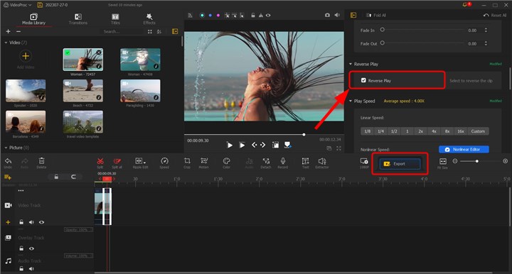 Step 3. Drag and drop your YouTube videos to the timeline. Select the video clip you want to reverse on the timeline and click Reverse Play on the right panel. Click Export when done.