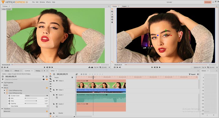 Compared with other green screen software, HitFilm is more focused on visual effects. You can use two different tools to composite the foreground clip and the background clip: Colour Difference Key and Hue & RGB Key. More so, if you need a more powerful keying feature, it also offers a paid Chroma Keyer.