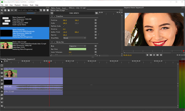 Olive is also a free and open-source video editing software that has a host of basics and essential tools and features that are parallel to some professional video editors. One important tidbit to know is that you can composite and key out green screen clips easily. That's what I appreciate it!