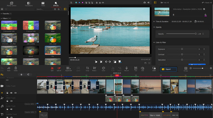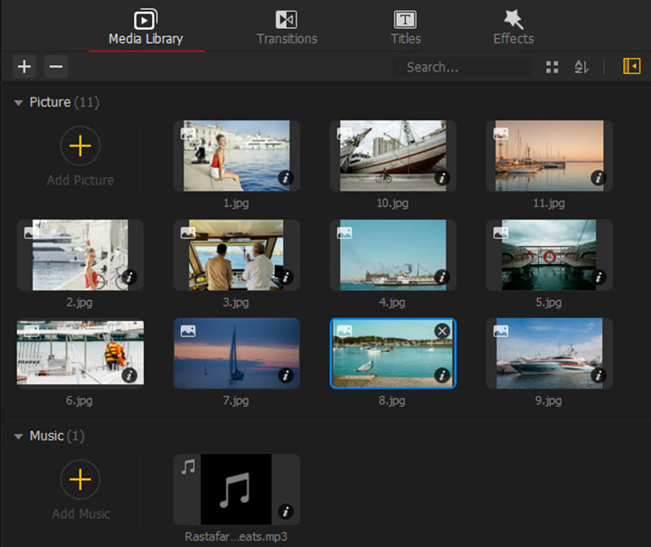 To make the picture video more engaging, you can add effects, transitions, and titles preset in VideoProc Vlogger which are next to Media Library.