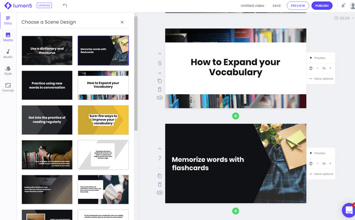 If you are looking for an easy method to turn blogs and articles into videos, Lumen5 is the answer. Powered by an AI engine, it can quickly produce slideshow-style videos, with each scene featuring titling, content, pictures, or video clips.