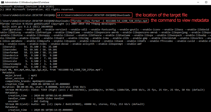 Step 4. Run the command to view the metadata information of your video file. Let's say you need to view metadata information of an MP4 file, enter: ffprobe -show_format -i your_video_file.mp4