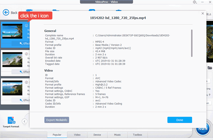 Step 3. Click the i icon to open up a new panel, where you can find the metadata information of your video file. If necessary, you can click Export MediaInfo to export the video metadata information.