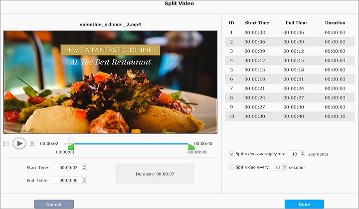 What is the best free video splitter software to batch save videos without quality loss? A good video splitter will help you to cut up the footage into several clips, and re-wrap them into MP4, MOV, MKV or any other format as you wish. You can specify the point to split, how long you want each mini-clip to be, or how many segments you want to evenly split the video into.