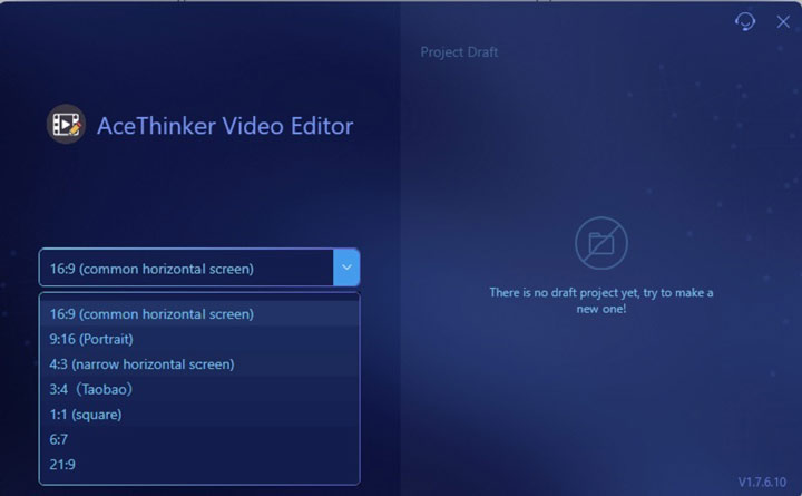 Without any complicated steps, AceThinker Video Editor Pro can also change the aspect ratio of any video easily. As a preset, you can easily set the aspect ratio between 16:9 (common horizontal screen), 9:16 (Portrait), 4:3 (narrow horizontal screen), 3:4 (Taobao), 1:1, 6:7, and 21:9.