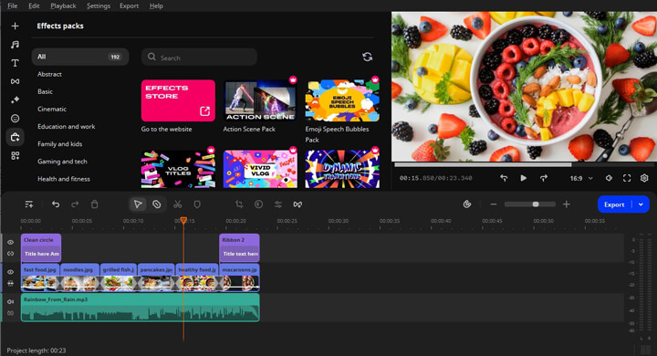 Although the feature set isn't that broad compared to some pro editors, it covers all the basics and has some nice touches like automatic video creation. The program also provides access to royalty-free intros, effects, transitions, and more to level up your videos.