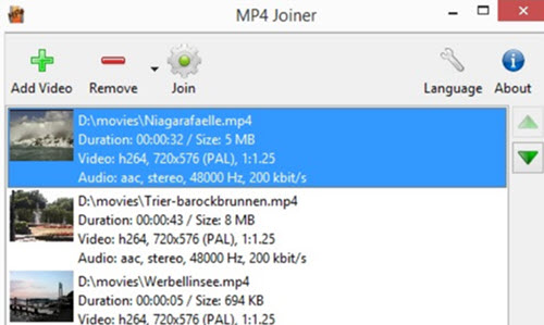 MP4Joiner is a lightweight utility to combine video clips. As its name suggests, it only supports MP4 container format currently. It works best if your videos are encoded using the same codecs, and are in HD or lower resolutions.