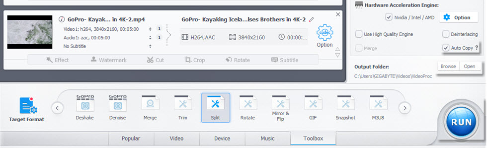 Click Browse button to set a new destination if necessary. Then, click RUN button to get VideoProc Converter AI split MP4 file.