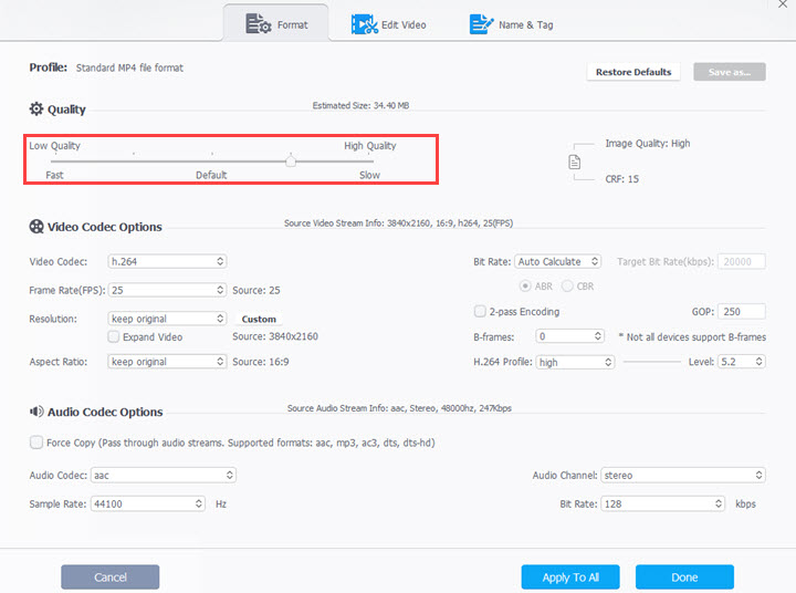Step 3: Move the slider between "Default" and "High Quality". You will see the values of CRF and Target Bit Rate are changing accordingly. Note that "High Quality" needs comparatively more time to process the encoding. Then "Done".