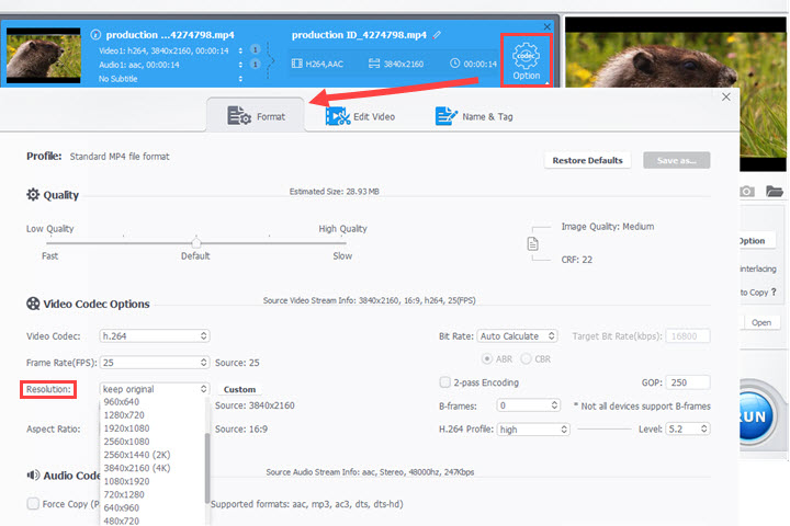 Step 2: Click "Codec Option", find "Resolution" under "Video Codec Option" area, and then choose your desired resolution from the drop-down list. You are also allowed to "Custom" video resolution. Then "Done".