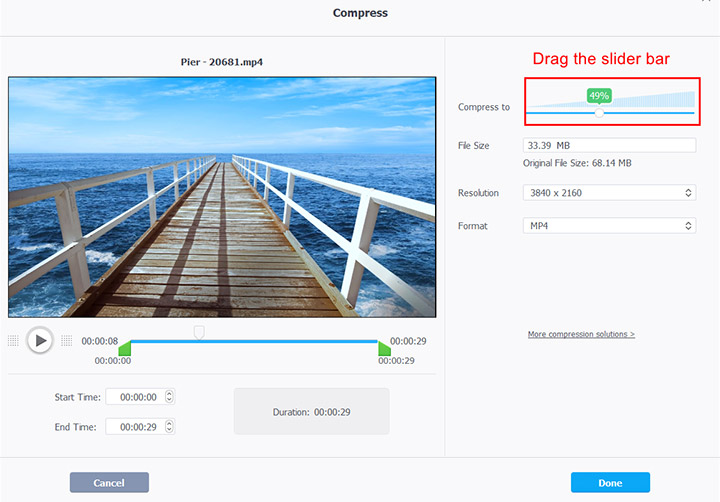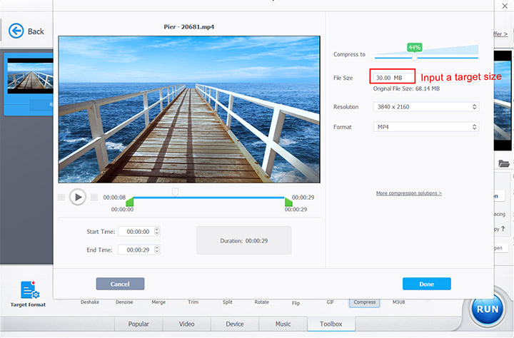 Go to the "Toolbox", find "Compress", and double-click to open it. You can simply drag the compression slider to set the desired compression ratio. Surely, you can also enter your target size directly. Hit Done to confirm.