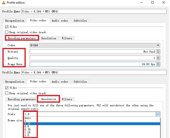 To make a video file smaller in VLC, you can also go advanced by clicking the wrench icon to adjust the video and audio bitrate, quality and frame rate under encoding parameters. It also allows you to scale down the resolution by 1/4, 1/2, 3/4.