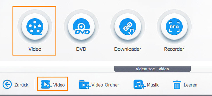 Schritt 1: Starten Sie VideoProc auf Ihrem Computer. Klicken Sie auf der Hauptschnittstelle auf Video. Ein Videofenster wird angezeigt, klicken Sie dann auf den + Video-Button und wählen Sie den zu importierenden iPhone-Videoclip aus.