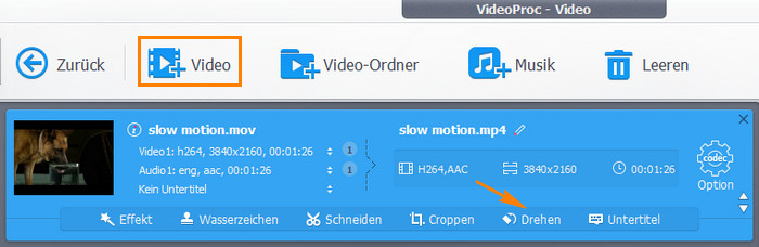 Klicken Sie auf den Drehen-Button unter der anstehenden Datei zum Zugriff auf die Schnittstelle der Videobearbeitung.
