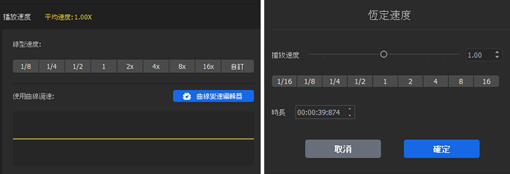 第 2 步. 匯入媒體內容,例如影片、照片、音訊 > 將媒體內容從媒體庫拖曳至時間軸 > 在右邊的屬性面板裡找到 播放速度 > 這裡預設了各種影片加速、放慢選項,也可以自訂速度。如果想要進階的調速工具,點旁邊的 曲線變速編輯器 即可。