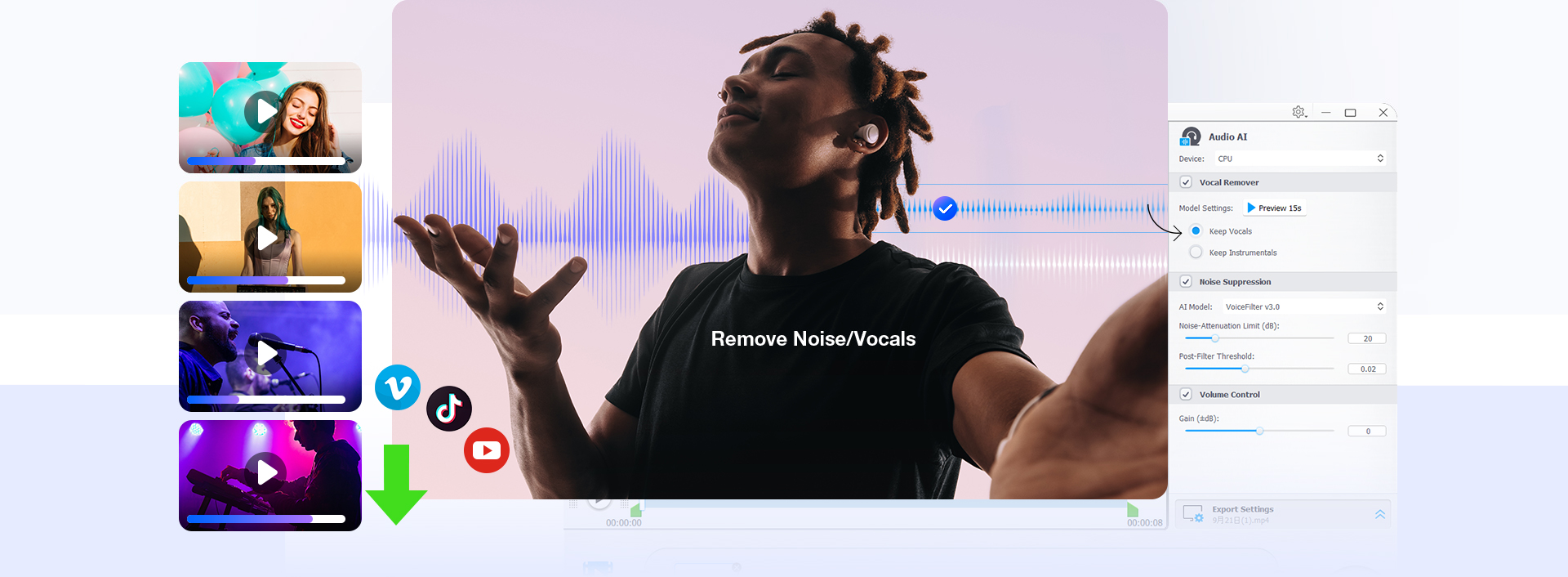 我嘗試使用去除人聲功能來分離人聲和伴奏,效果非常出色。音軌保持清晰,且降噪器讓所有聲音聽起來更加乾淨。這對我的音樂專案來說是個改變遊戲規則的工具。