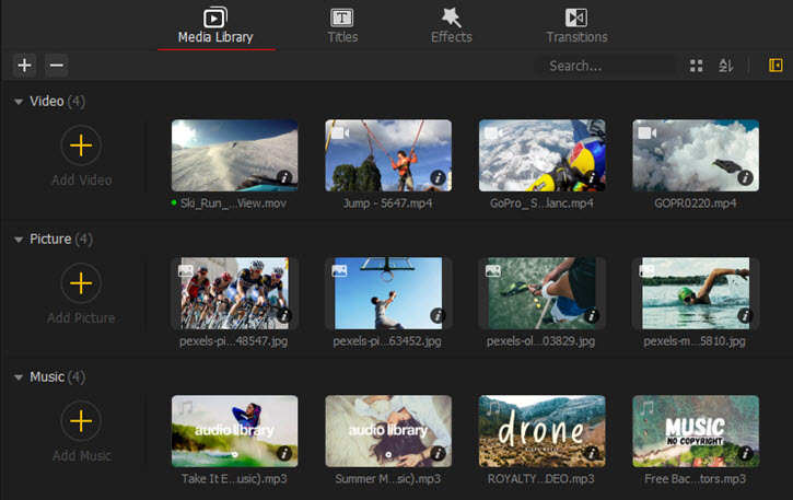 媒體庫面板中有三個選項 – 影片、圖像與音樂。您可以點擊各個選項的三角圖示來隱藏或是展開您所匯入的所有媒體檔案。