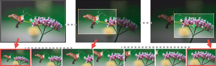 您可利用 VideoProc Vlogger 中的動作裁切編輯器來調整觀影範圍,您在觀影範圍中將可供您實時檢視編輯後的成果,而觀影範圍中關鍵影格之間的轉換則將忠實呈現不同的動態效果與各種不同方向的轉場。