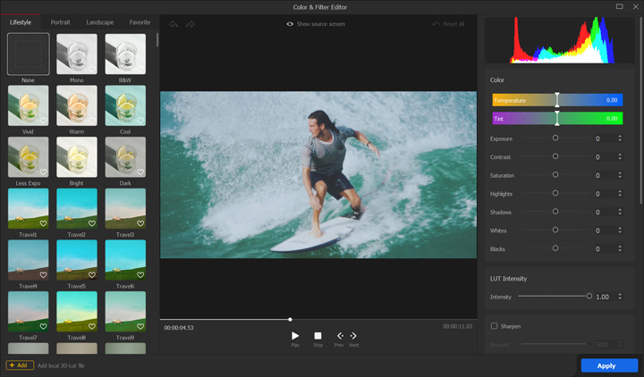選擇影片檔案並在屬性面板中選擇色彩&濾鏡。您可在此調整各項參數如:曝光、對比度與飽和度,來取得您所需的效果。如您要節省時間,可在色彩編輯器中選擇3D Luts。此處選擇眾多,您可自行挑選適合的設定,來替自己的影片添加具自己風格的色調,使影片更具吸引力。
