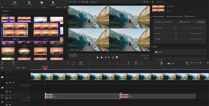 將影片加入時間軸,打開特效面板,選取四格或六格並拖曳至視訊特效軌道,會看到影片畫面被等分為四塊或六塊。把游標放在特效片段的邊緣可以拉伸以改變此特效的持續時間。