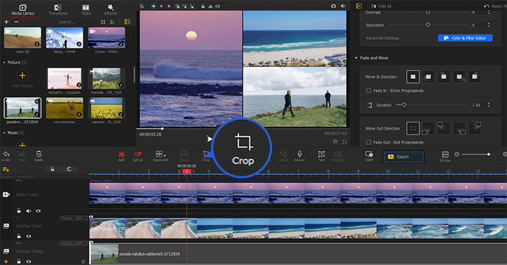 步驟 7 在影片 00:04:00 處之後,影片一將轉為全螢幕,其他兩部影片將消失。請點擊影片一,點擊裁切圖示,選擇 16:9 來切換至影片的原始長寬比。